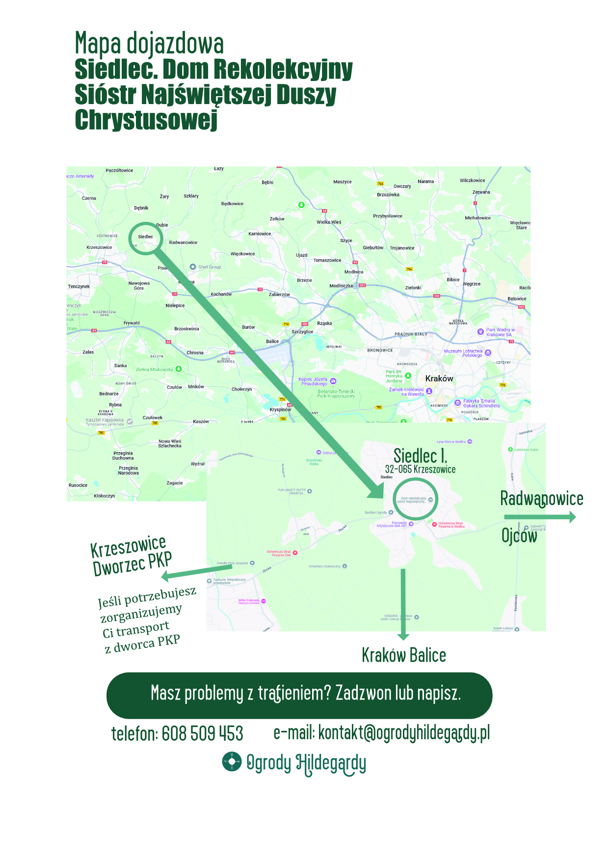 Osoby dojeżdżające do Krzeszowic pociągiem prosimy o wcześniejszy kontakt i umówienie się na odbiór z dworca PKP. Proszę o telefon pod numerem 608 509 453