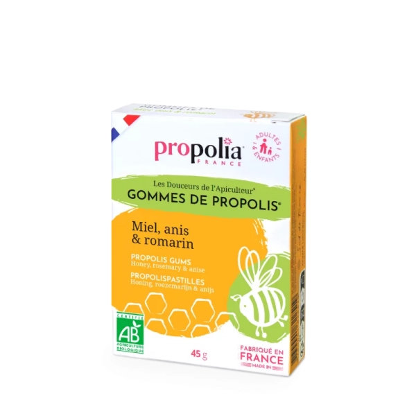 Substancja zagęszczająca: Guma arabska*, czysty brązowy cukier trzcinowy*, miód*18%, oczyszczony ekstrakt z propolisu* 3%, eteryczny olejek rozmarynowy* (Rosmarinus officinalis), naturalny anetol i aromat cytrynowy.